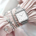 We are sure this statement accessory is going to be the talk of the day! It features our all silver square dial watch paired with shiny bracelets with hearts and star motifs that will add a dreamy touch to the look.